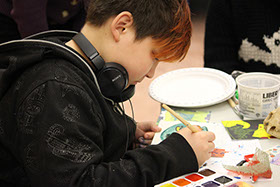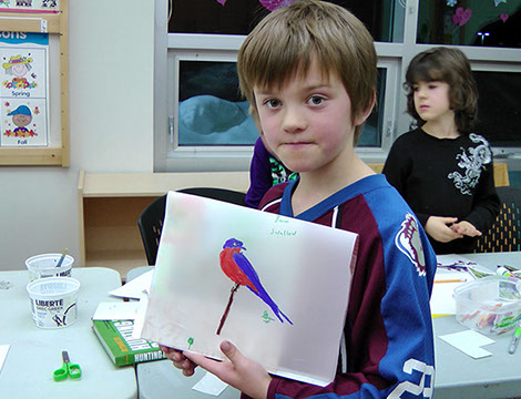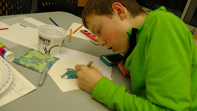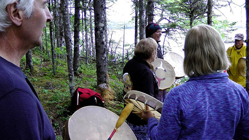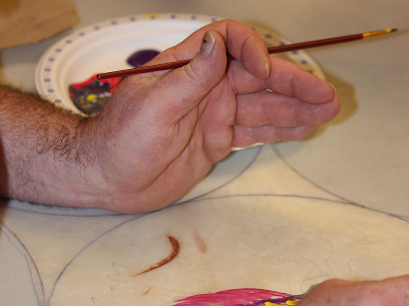 Children at Atlantic Memorial and Terence Bay elementary school participated in workshops in weaving, stained glass, ceramics and drumming. They were visited by Mi’kmaq documentary film-maker and drummer Cathy Martin to learn about the long and rich history of Mi’kmaq cultural, social, political and spiritual traditions. She shared in Mi’kmaq belief that all living things—plants, animals and humans—are interdependent on each other as she screened her documentary film of Alan Syliboy’s animation, The Little Boy Who Lived with Muini’skw (Bear Woman). The children learned about the drum through dance, singing and drumming with Cathy. Within Mi’kmaq culture the drum is, “the heartbeat of the Creator, the heartbeat of life and the people, we live the first nine months of our life in the womb of our mother listening to her heartbeat which sets the pattern of our existence”. (http://qalipu.ca/departments/culture-and-heritage/). Our drumming workshop was also held at Prospect Road Community Centre along with the film screening.