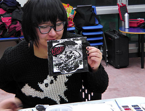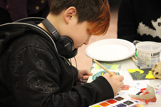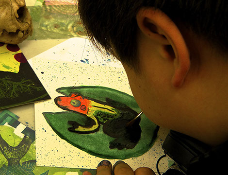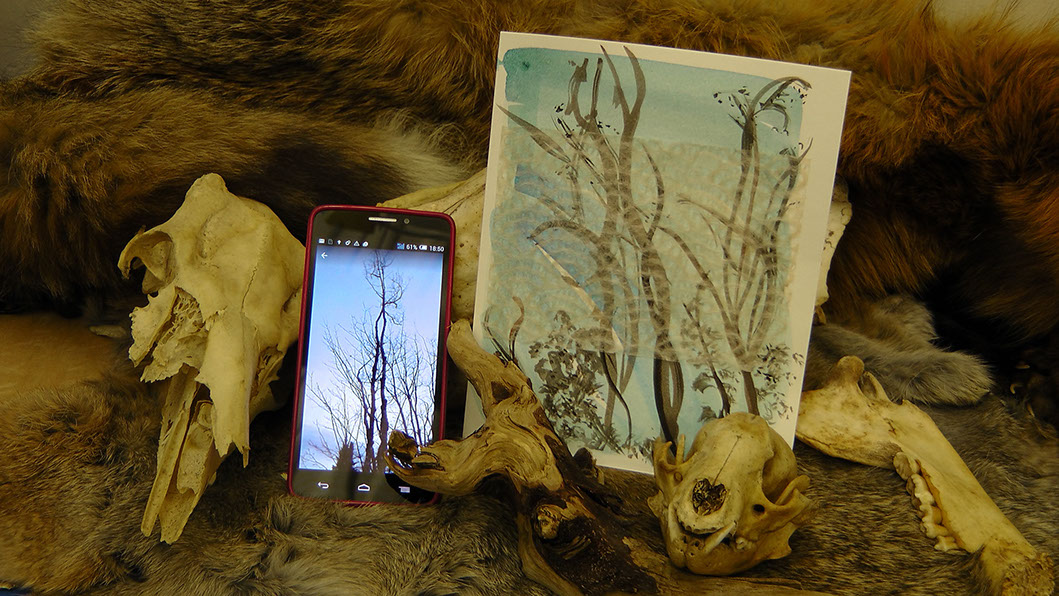 Within the forest biome we were concerned with ecology – the relationship of living things to each other and to everything in their surroundings, or homes. We created drums from the trees and animal skins, we went on art walks to Nichols Lake, and learned how to protect and respect the forest with first nations drummers, local artists, scouts, and environmentalists. Using materials inspired and gathered from the forest we created drums, videos, paintings, prints, photos and music.