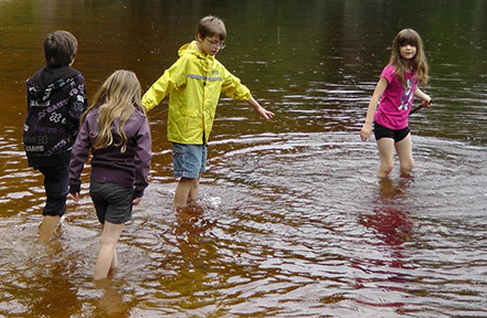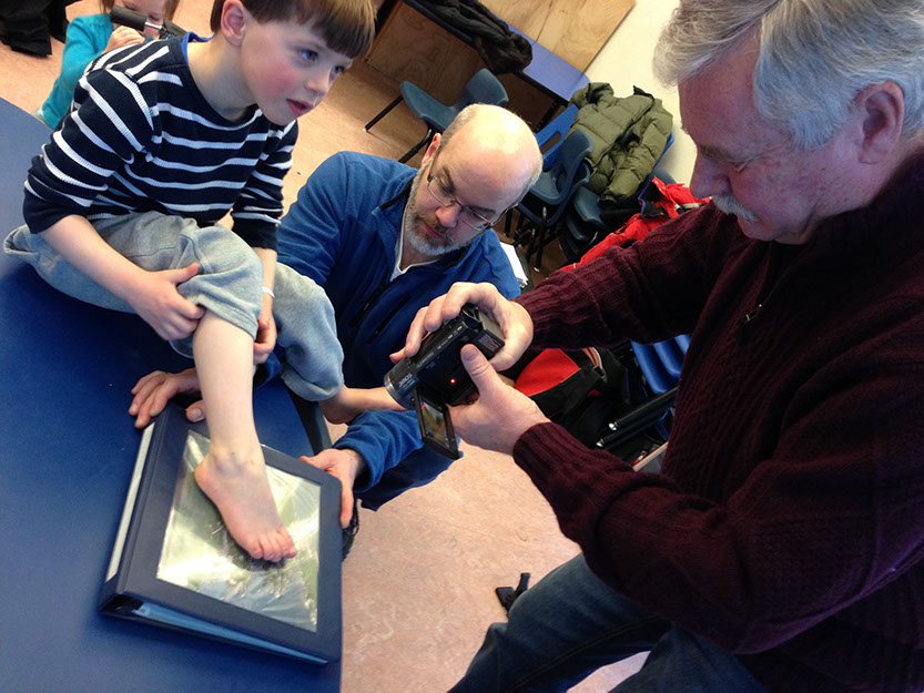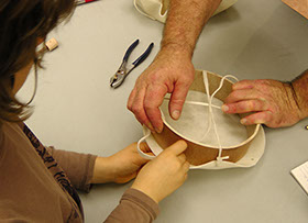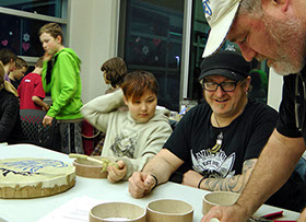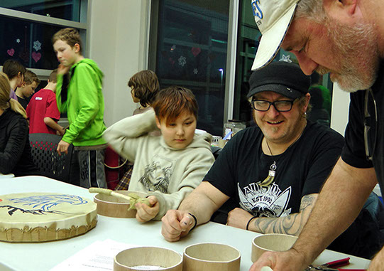 Together with architect Peter Gamble we built a drum from forest wood and animal skins. The children learned all aspects of drum making, from preparing a deerskin, to stretching the drum, to painting it and playing it.