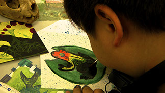 Within the forest biome we were concerned with ecology – the relationship of living things to each other and to everything in their surroundings, or homes. We created drums from the trees and animal skins, we went on art walks to Nichols Lake, and learned how to protect and respect the forest with first nations drummers, local artists, scouts, and environmentalists. Using materials inspired and gathered from the forest we created drums, videos, paintings, prints, photos and music.