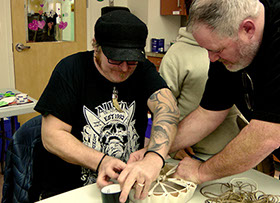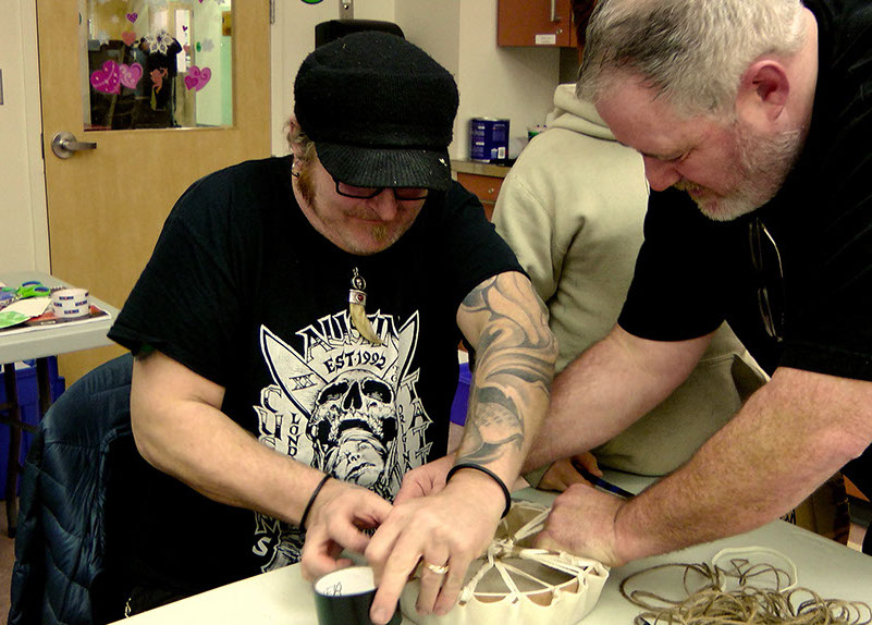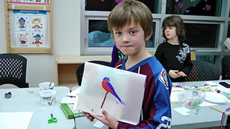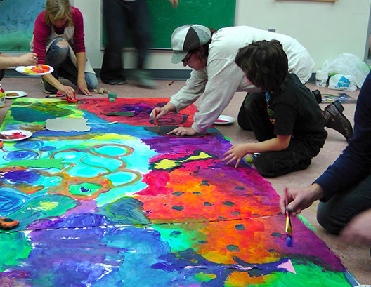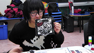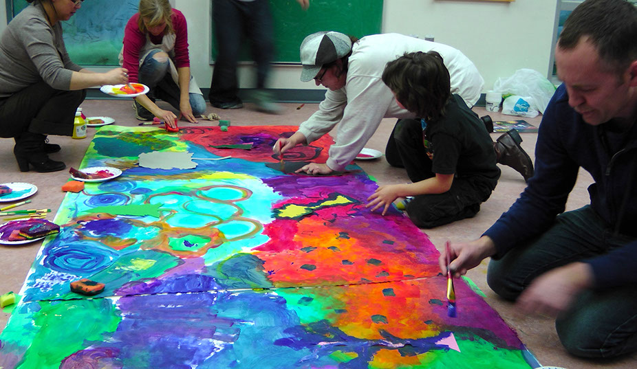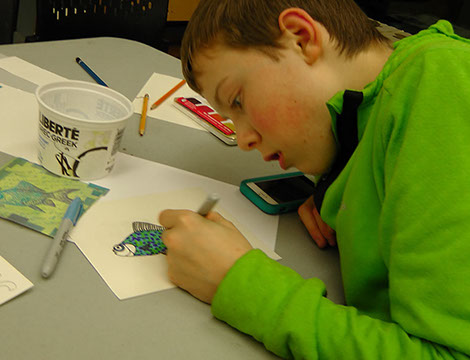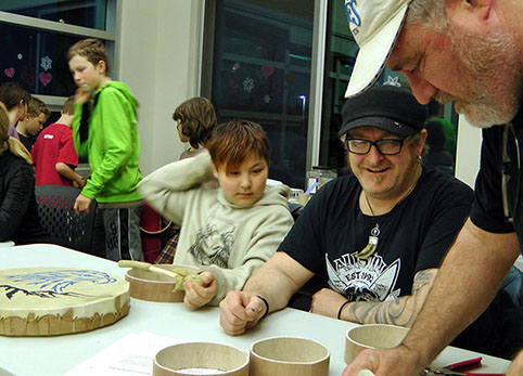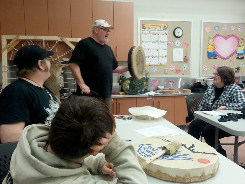 Children at Atlantic Memorial and Terence Bay elementary school participated in workshops in weaving, stained glass, ceramics and drumming. They were visited by Mi’kmaq documentary film-maker and drummer Cathy Martin to learn about the long and rich history of Mi’kmaq cultural, social, political and spiritual traditions. She shared in Mi’kmaq belief that all living things—plants, animals and humans—are interdependent on each other as she screened her documentary film of Alan Syliboy’s animation, The Little Boy Who Lived with Muini’skw (Bear Woman). The children learned about the drum through dance, singing and drumming with Cathy. Within Mi’kmaq culture the drum is, “the heartbeat of the Creator, the heartbeat of life and the people, we live the first nine months of our life in the womb of our mother listening to her heartbeat which sets the pattern of our existence”. (http://qalipu.ca/departments/culture-and-heritage/). Our drumming workshop was also held at Prospect Road Community Centre along with the film screening.